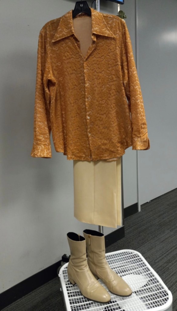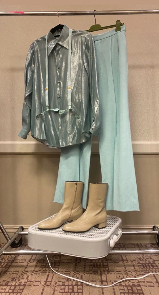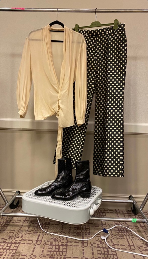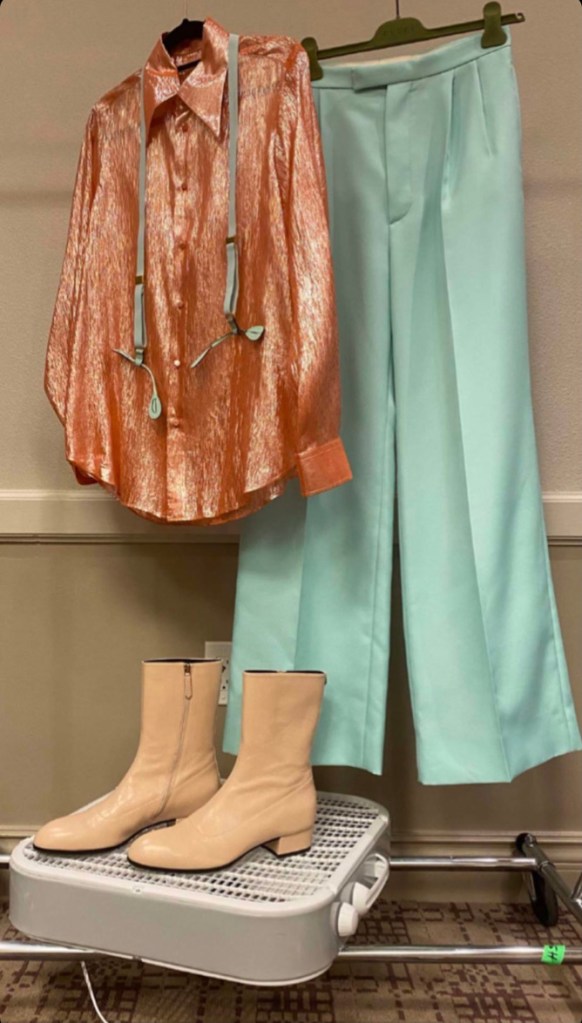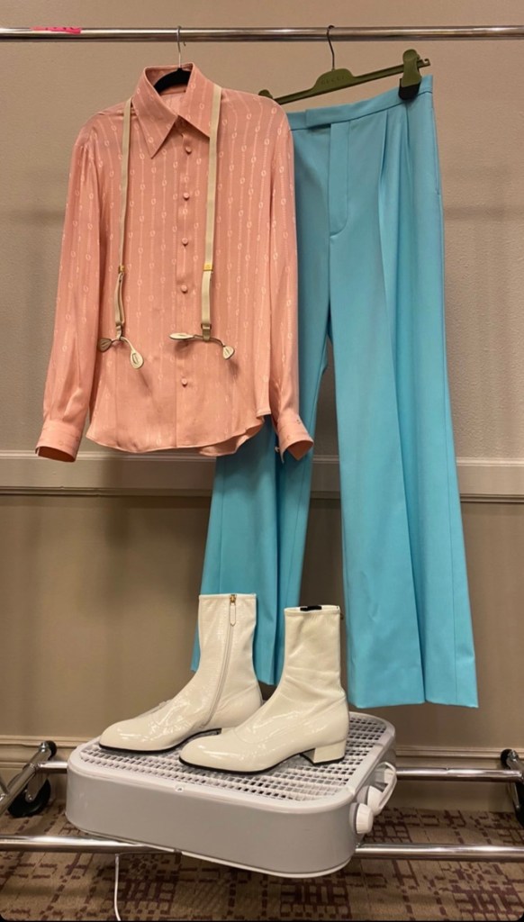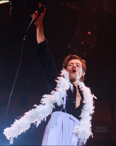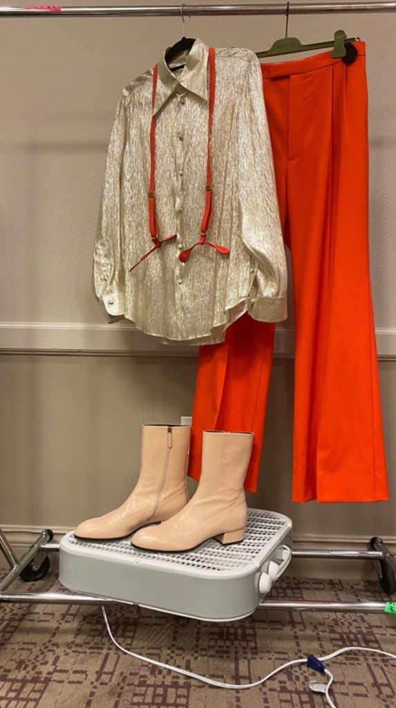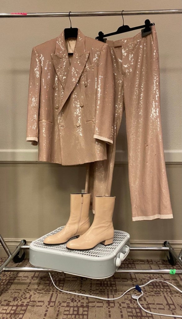 We swiftly move along to his show in Boston! He didn’t wear red so we are all good and that is fine. He wore this champagne coloured sparkly sequinned top paired with blue trousers, with his suspender and cream coloured boots.