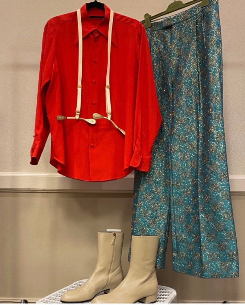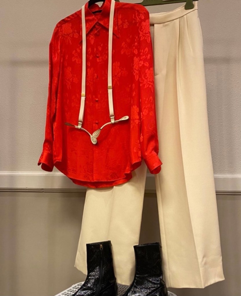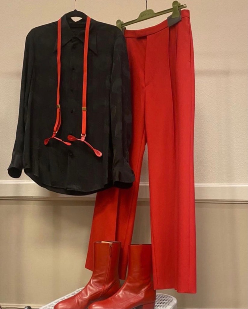 He changed the black textured shirt to a red one, keeping the red trousers and changing the suspenders and boots for black versions. He can pull it off, we just want some different and special!
