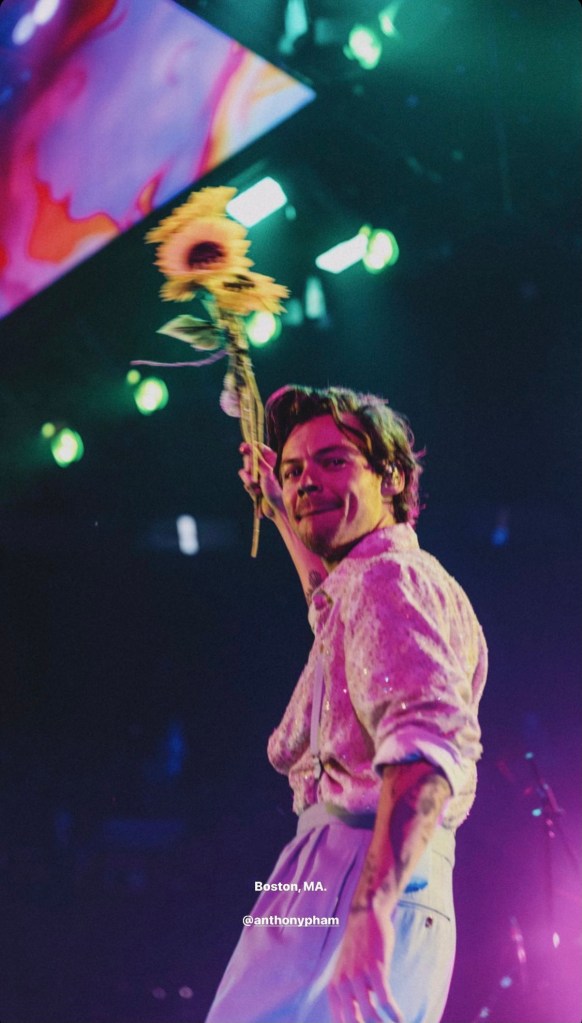 He also put a sunflower in his mouth at this show and looked so good. Harry Styles is one of a kind! He knows how to put on a show and the Style in Styles.