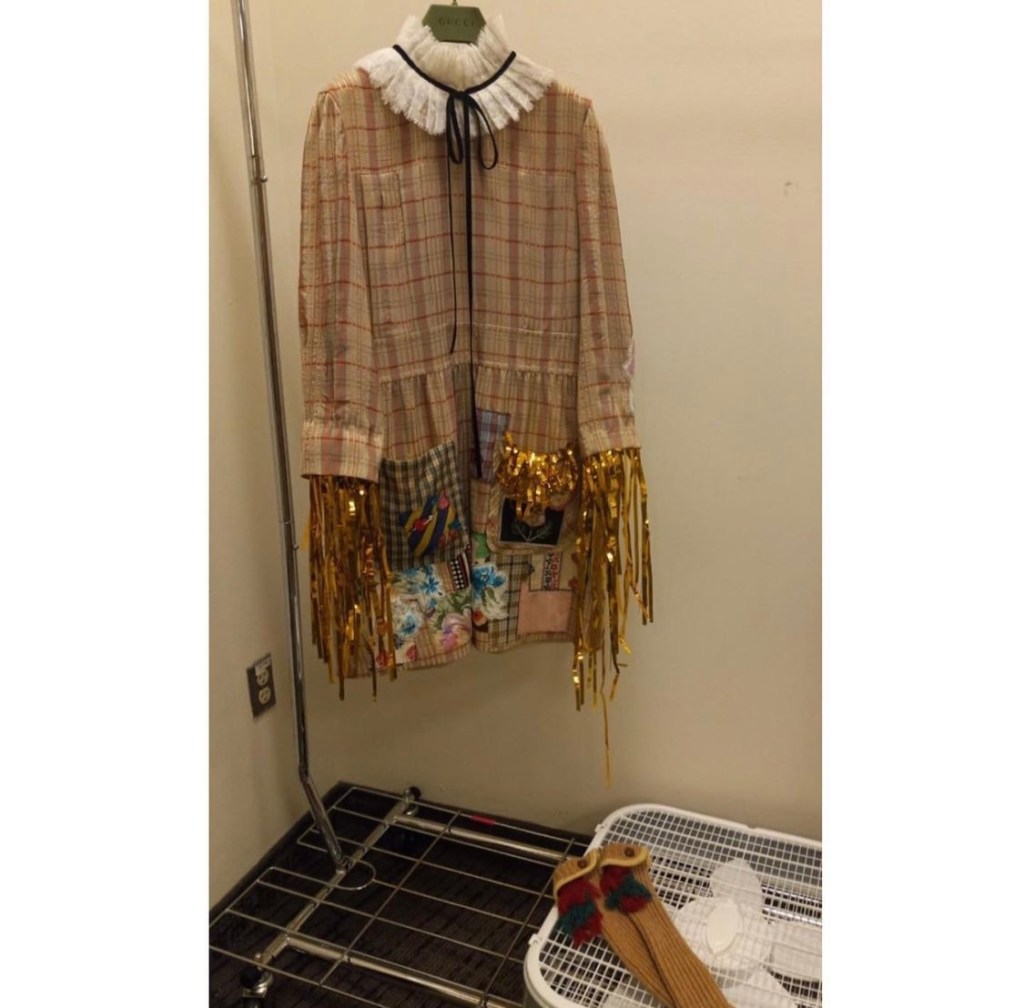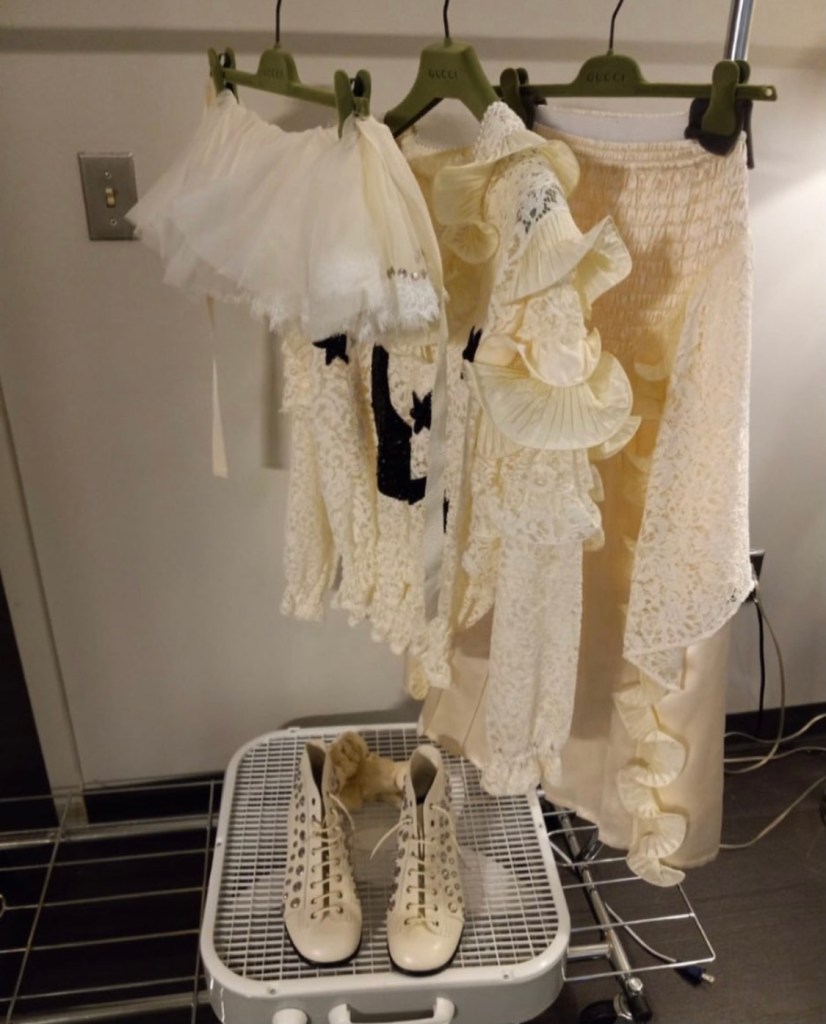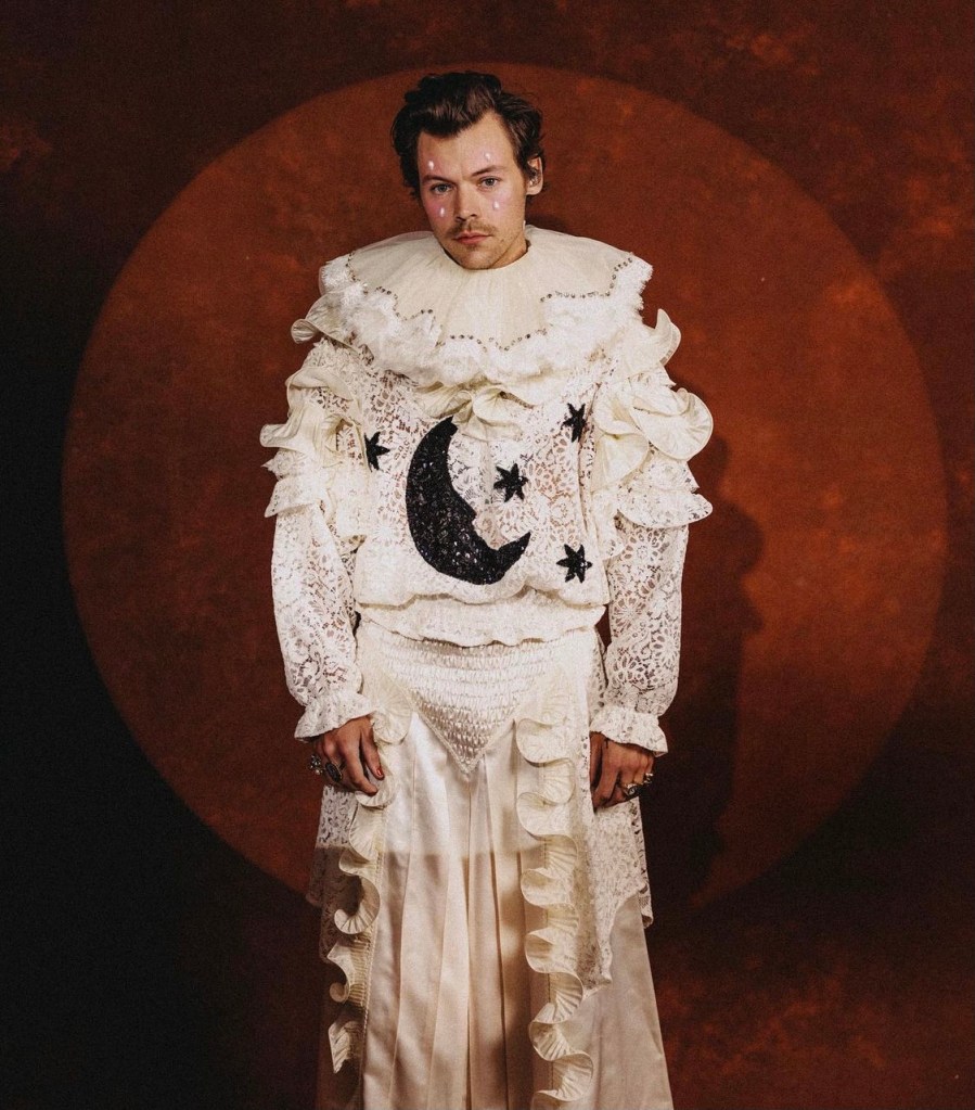 Harry wore this gorgeous looking custom made Gucci Pierrot clown inspired costume. The was lace and had a moon on it with stars. His pants were also laced that he paired with this white ruffled collar and white studded lace-up boots.