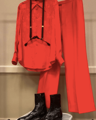 We got a little Mikey mouse action happening with this outfit. He wore this silk black shirt that had textures on it with red trousers, suspenders and boots. Literally all red but his shirt that I love so much. Black looks so good on him.